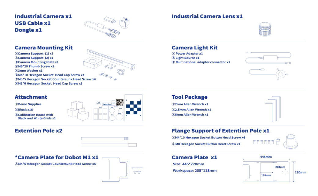 DOBOT Robot Vision Kit provides an essential software and hardware platform based on visual development. With the advantages of rich functions, stable performance, and convenient operation, it perfectly meets the needs of optical applications, including visual positioning, measurement, detection, and recognition. DOBOT Robot Vision Kit obtains a clear and intuitive design, making it easy to operate.
